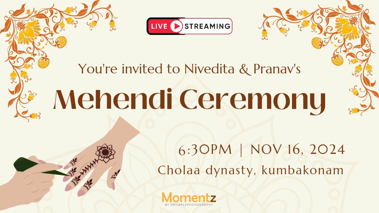 Mehandi - Nivedita & Pranav | 16-11-2024 6:30 PM | Cholaa Dynasty, Sundaraperumal Koil, Kumbakonam