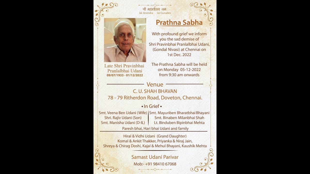 Prathna Sabha - Late Shri Pravinbhai Pranlalbhai Udani | 05-12-2022 9.00 am | C.U.Shah Bhavan